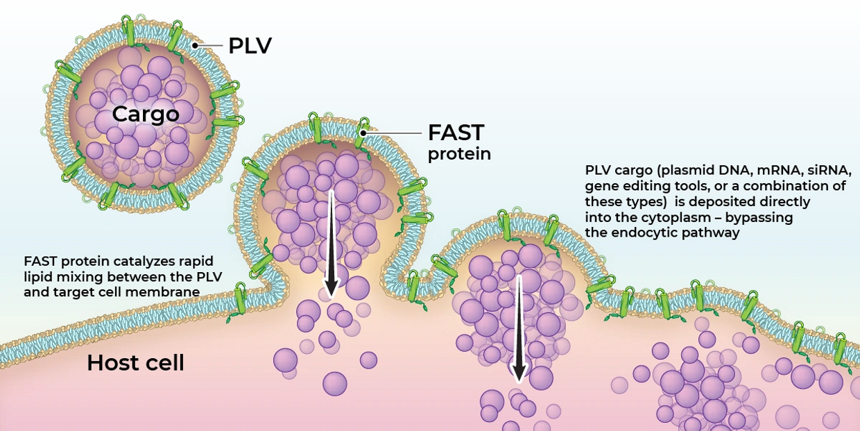 In our PLV platform, FAST proteins mediate direct fusion with the cell membrane, bypassing endocytosis and delivering RNA, DNA or gene editing therapies directly into the cytoplasm of the cell.
